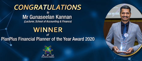 祝贺来自马来西亚亚太科技大学会计与金融学院的讲师Gunaseelan Kannan先生,他在金融规划行业的杰出能力和积极贡献获得了PlanPlus颁发的2020年度财务规划师奖。PlanPlus....点击详细>>
